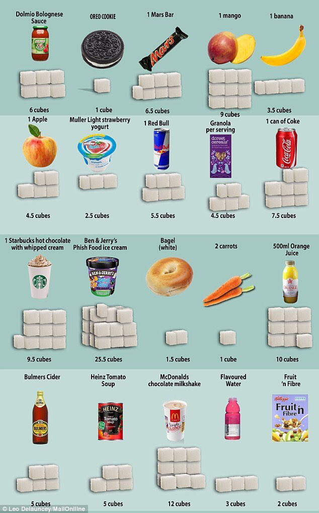 represented as cubes of sugar.The bottom left hand corner of the graphic reported the source as “Leo Delauncey/MailOnline”, but the picture had no label to describe exactly what was being illustrated. It made me wonder – is that added sugar, free sugars, or carbohydrate? What’s the difference anyway? This proved to be a really enlightening issue to explore.